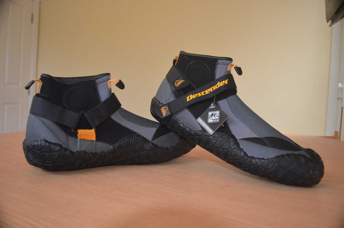 I really like my Palm Descenders for a couple of reasons: first, they are really tough and durable so even jumping across sharp rocks etc my feet feel perfectly safe, and the boot itself lasts really well. This is especially useful because other shoes made primarily of neoprene have a tendency to rip and fall apart while, having owned my Descenders for a year and a half there is no sign of wear other than a bit of fading. The boot has 2 Velcro straps which hold onto your foot tightly without being uncomfortable and they do not come undone easily, when river-running I never need to take the boot off unlike for freestyle, so a boot which stays on getting in and out of the boat (or even during a swim) is very useful. My one criticism on the comfort front is that if you don’t wear socks underneath, the ankle band digs in a bit and leaves you with an annoying red mark. The inside is made of some sort of high-tech thermal material which means my feet have stayed warm even in very cold conditions. I know my Palm gloves have the same yellow material on the inside and it really does the trick: your feet could still get cold, but the material appears to be warmer and more comfortable than neoprene. The boot works a bit like a wetsuit and traps the water inside where it warms up and keeps your feet toasty, however due to the thick material even without water inside they keep your feet remarkably warm anyway. One main problem with kayaking footwear is grip: slipping on moss and wet rock, most shoes struggle with this environment but Palm have had a decent stab at this and mostly the grip is perfect. Price-wise they set you back about £50, but as protection for your feet which will last at least 2 years I think it is on the low side and they offer great value for money. To sum the Descenders up – they are durable and withstand a lot of abuse without tearing or coming apart, they are comfortable to wear and do a great job of protecting your feet due to the thick rubber sole while staying solidly attached without the feeling that they might slip off, they keep you warm no matter what (and if they don’t then you should consider a dry suit), the grip is good so there’s no slipping over when scouting rapids and finally the price is bang on for what you get back from the product.
