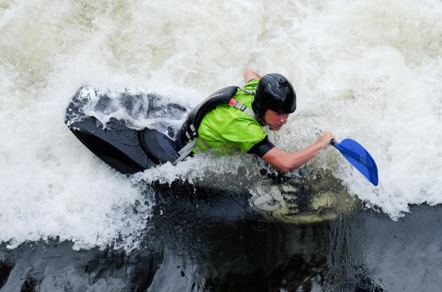 Now that your boat’s trim is perfect and you’re sitting high enough the next step is to adjust your footblock. Some people prefer to use a foam block, I prefer to use Jackson Happy Feet when freestyling (I know, heresy in a Pyranha) and of course in a river-runner there’s just a footplate. Effectively you want to be sitting square on your seat with the backband as tight as you like it and to be able to push against your footblock without it moving or having any moment where you aren’t connected. This is really easy to do in most river-runners just by using the screw and rail system, if you use a foam block then you’ll have to cut it down to size (making sure not to cut off too much). When I set up my Happy Feet I do 3 things: first I cut of the back part of the airbag (if you need to inflate it add foam behind instead because otherwise it’s impossible to apply even pressure from both feet on a bag of air), second I inflate the bag and make sure it’s placed symmetrically in the bow of my boat so that my feet are supported equally and third, I sit in the boat, tighten the backband and make sure i’m comfortable before I suck all of the air out (and you must sure you get all of otherwise you’ll have to repeat this entire process every time you want to use your kayak). The main reason I prefer Happy Feet when freestyling is that I really kick out hard and the Happy Feet (which are moulded around the shape of my feet) stay in place, consequently my toes and heels don’t rub against the inside of my boat and I can stay on the water longer without getting rubs.