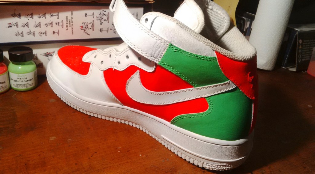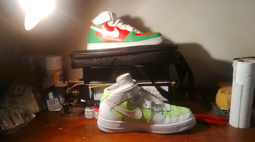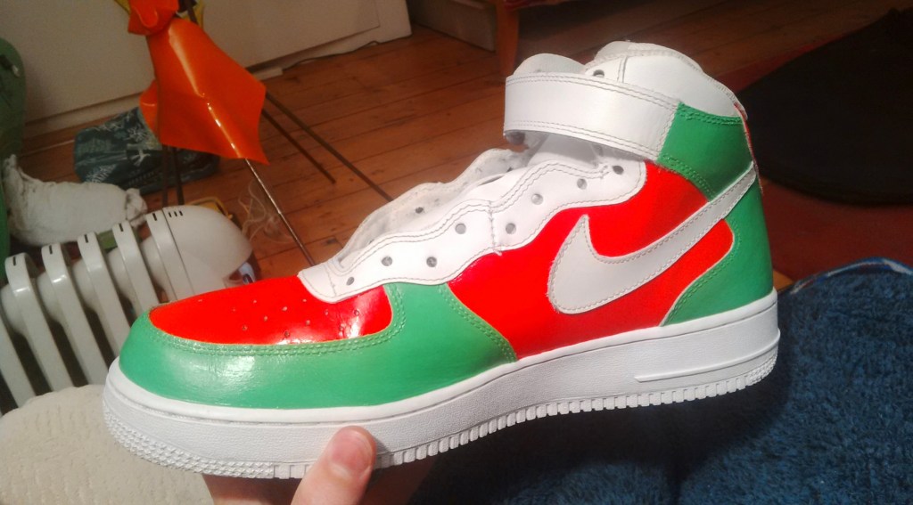 When I initially started the green I wasn’t sure what to do with the grey section on the edge of each outstanding panel but in the end I decided to leave it grey, anyway I figured that when I’m wearing the shoes you wouldn’t actually be able to see edges unless you lay down and looked at them really closely. The stitching was actually the hardest part because it didn’t want to absorb the paint so I had to use really thick layers to go over it, consequently it was also harder to get an even finish over the whole panel if the areas around the stitching needed to be thicker…