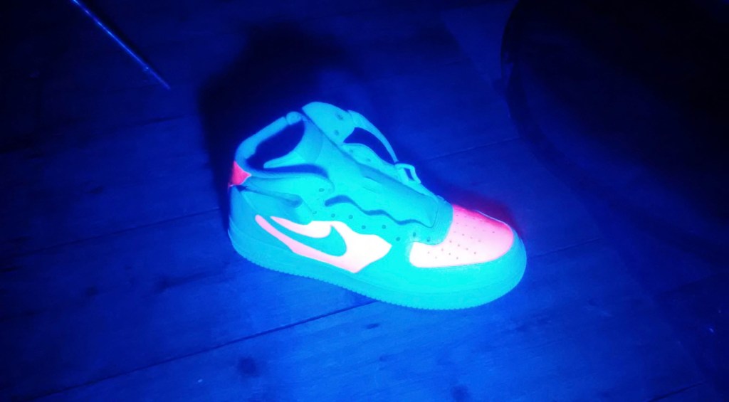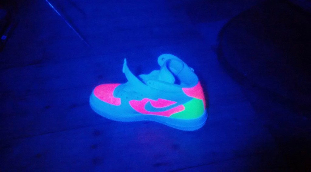 I happen to have a Philips lamp in my room which does the same thing as a black light. It has a slider so you can change the colour it glows but I noticed a while ago that when it was on the blue setting it made certain objects in my room glow (anything transparent or white) so I turned the lights off and shone the lamp on my shoe once the pink panels where finished and it looked sick. It also made it really obvious where I’d screwed up or accidentally got a tiny speck of paint on a white panel which meant that I spend rather a long time correcting my mistakes with warm water and a sponge.