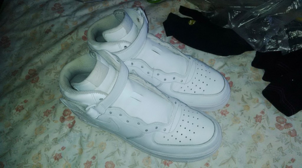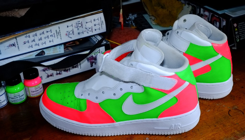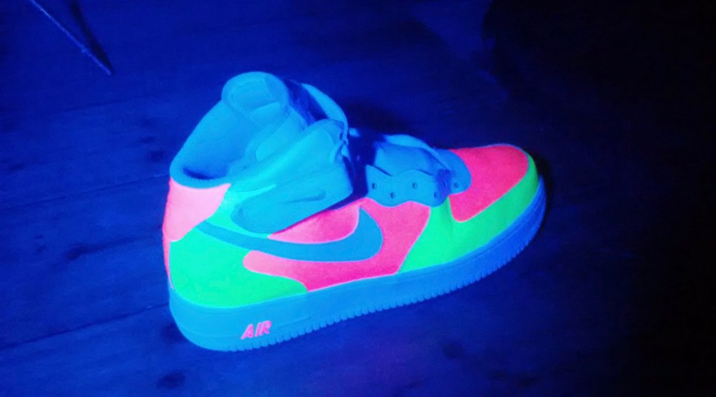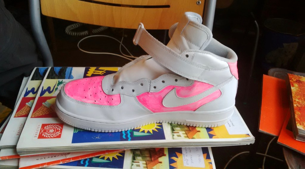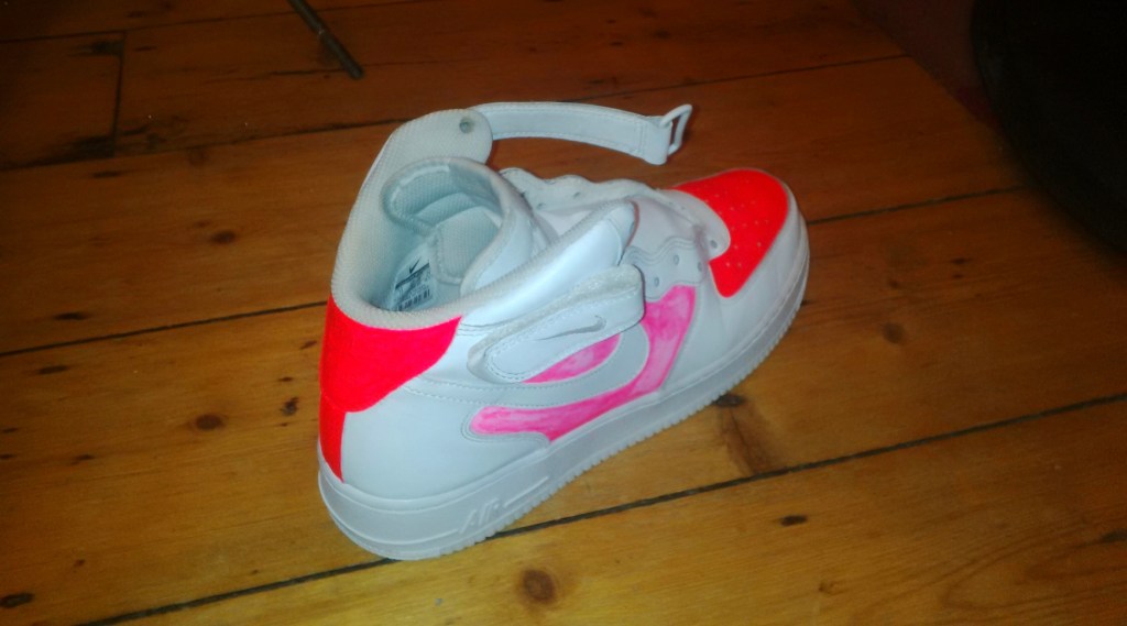 I chose a pair of Air Force 1 mids because I liked how they looked and lots of people seem to be wearing them. They are a popular shoe to customise because they’re easily available, come in all white and have largish blank panels that are easy to paint on, after finding a pair for £39 on Ebay that sealed the deal, I ordered them and they arrived within a day or two. I chose to use Angelus leather paints because after doing some research into which paints I should use on leather, Angelus paints seemed like the best option because they’re actively designed to go on shoes, lots of people have used them with good results and they weren’t too expensive (roughly £5 per colour). I found out there were neon options (so they glow under black lights – those blue lights you see at concerts or parties etc) and so I chose Popsicle Green combined with Tahitian Pink and a Satin Finisher (to protect the shoes with once I was finished) which seemed to be good choices…