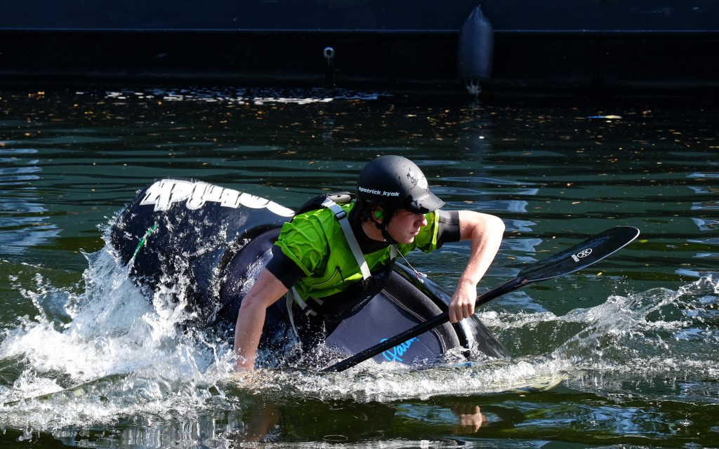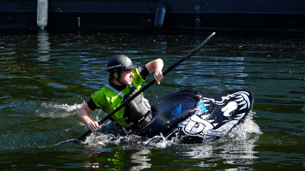 Once you can comfortably do this, the next thing to introduce is the backwards stroke. Once you’ve gained momentum and you’ve done a hard forwards stroke while on edge to lift the bow out of the water, you’ll find your core has wound up; as soon as you feel the bow falling you need to unwind your core in a hard backwards stroke intending to push the bow underneath you. This is the difficult part. Make sure not to lean back at all during the backwards stroke, you should stay neutral until the bow falls and then throw your weight forwards. For those of you who have done GCSE physics it’s all about pivots. The more weight at the front of the boat, the easier it will be for it to submerge and the stern to lift out of the water due to the force of your backwards stroke.
