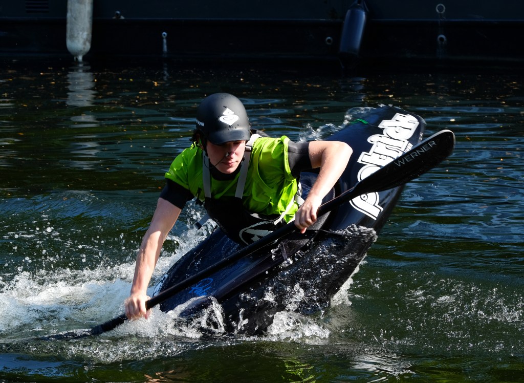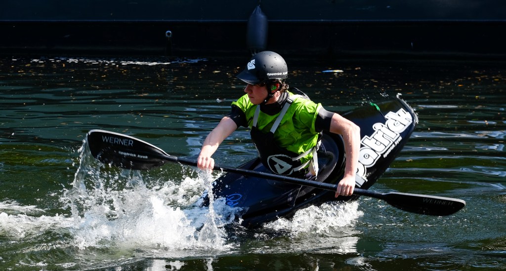 First things first, paddle forwards at a steady speed – this will help get the bow down once you initiate the move. You want to place a firm paddle stroke in starting right at the front of your boat and finishing next to your hip while edging towards that paddle blade at an angle of 30-40 degrees. The aim of this paddle stroke should be to lift the tip of your boat out of the water so that you can slam it back down to get it under you. To practice this motion you can simply gain some momentum to help with balance and then edge the boat over slightly while doing a really hard forwards stroke on one side (ignoring the backwards stroke for the time being) with the sole aim of lifting up the front of the boat.