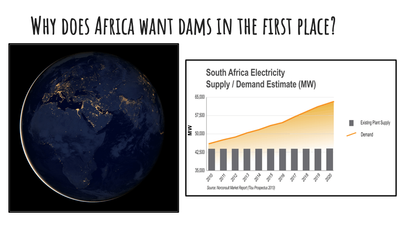 The world undertook a dam-building boom in the latter half of the twentieth century which was partly responsible for an increase in the global food supply and industrialisation, many African countries hope that they can emulate this. The picture on the left was taken by a NASA satellite and shows Africa at night, you can see all the lights from cities and towns etc. Africa seems quite dark in the picture, especially in comparison to Europe. This is because electrification rates are very low across Africa, with electricity demand being much higher than supply (as you can see from the graph on the right) the current electricity generation capacity is only enough to theoretically guarantee 33% of the African population access to energy. Hydropower seems like the perfect solution given that the continent holds enormous hydroelectric potential and less than 10% of it is exploited.