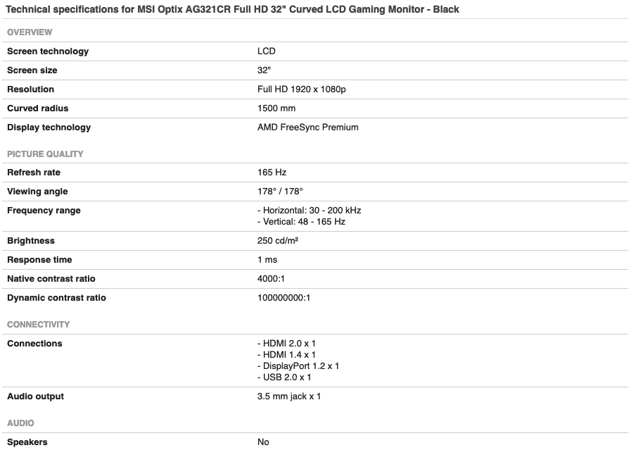 Having decided on all the nitty-gritty specs it was time to figure out things like size and additional features. I knew that I wanted to use the monitor as a TV at university as well as for gaming, so the size had to be large enough that I could comfortably watch something from my bed (say about 2m away) but not too large for any student accommodation – this meant that I needed something in the 26″-40″ range – preferably on the larger side – and I found out that when it comes to 1080p monitors, most don’t go over 32″ because the bigger the display the more pixelated the image will look. Moving onto additional features, I already had a good music system and therefore no need for built-in speakers (which a lot of monitors seem to have). I also wanted at least 2 HDMI 1.4/DisplayPort 1.2 ports so that I could use the monitor with both my gaming computer and laptop without having to unplug either (and both of those ports are good enough to display the required fps and resolution). Many curved monitors are now available quite cheaply and having tried a few in the past, part of me really wanted one as they felt much more immersive than a traditional flat screen. Finally (having an AMD Sapphire Radeon RX 570 ITX graphics card), one really useful display feature is AMD FreeSync which synchronises the monitor’s refresh rate with the graphics card’s frame rate to reduce or eliminate visual artefacts like input latency, screen tearing or stuttering. Given that most gaming monitors have FreeSync, I added it to my list of requirements which now included:
