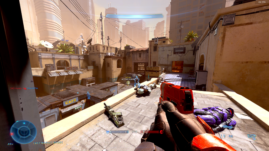 Let’s start off with the graphics. The first thing I noticed was how good Infinite looked. Yes, some textures didn’t load in, some surfaces were shinier than they should’ve been and I’m not entirely sure the resolution was actually 1080p when moving… but the lighting, the detail and the quality of the design-work was stunning. It was shame that I only really managed 45fps throughout the flight, and while I found that more than playable, other people did not (and changing the settings from ultra to low seemed to make no difference either visually or performance-wise). We were given 3 maps in total – Live Fire, Recharge and Bazaar. On Live Fire the mountain backdrop and glare from the sun provided a stark contrast to the harsh lines of the damp LED-lit corridors, Recharge had more of a power station feel with swirling generators brimming with glowing plasma and dark pipe-filled corridors meanwhile Bazaar was reminiscent of Halo 2’s New Mombasa, centred around a market square with palm trees, boxes of fruit and a distinctive reddish tint to the scenery. In terms of balance and how the maps felt to play, Recharge was far-and-away my favourite of the 3 – it felt how a Halo map should feel. There were multiple levels to the map (perfect for the grapple shot) and interesting nooks and crannies to explore. There was a central area for pitched battles but also tighter corridors for one-on-one firefights and the gravity hammer was perfectly situated for start-of-the-match squabbles. Live Fire was definitely the least ‘interesting’ of the maps visually, but it was good fun to play. I liked having the overshield out in the open and the grass field to the right of spawn allowed for long-distance engagement. Bazaar was (disappointingly) the least enjoyable of the maps although it looked really nice – I think some of the underground sections were difficult to find and not that usable strategically while the main battles were going on in the square.