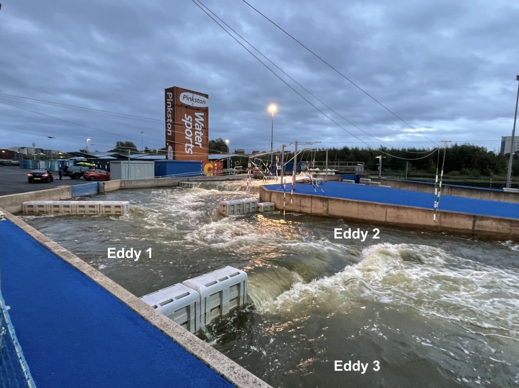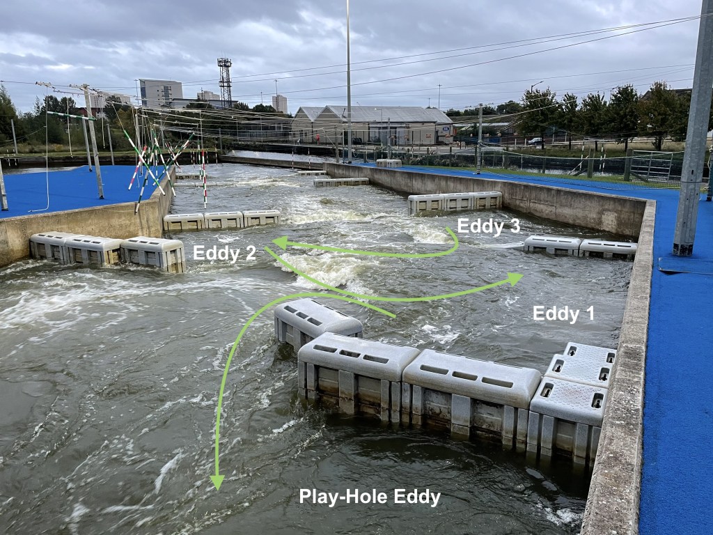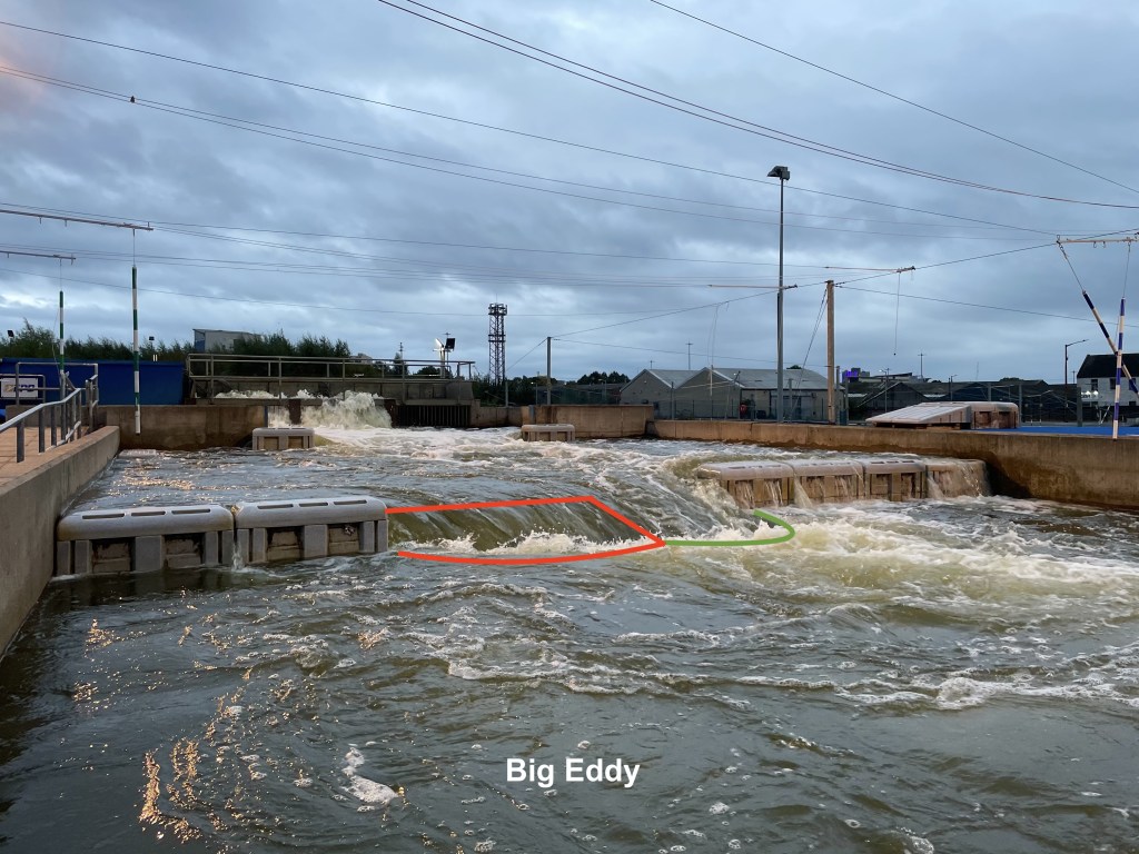Moving swiftly down the course, we have 4 large eddies which are great for eddy-hopping. There are two small waves which provide a good place to practise entering and exiting eddies with strong(ish) eddy-lines and you can easily eddy-hop back up to the top.