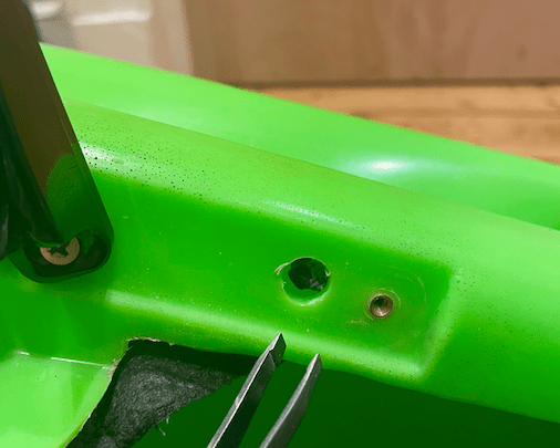 Depending on which boat you have, the process of replacing the backband is either a very simple or an extremely annoying process. In a plastic GuiGui the cockpit rim is hollow and you can put your fingers inside… this means that feeding the new rope up through the top hole is easy and at most you’ll need a screwdriver and some tweezers. On the other hand, the Rexy’s cockpit rim is sealed off (god knows why) which means that you’ll also need something long, thin and flexible to push the new rope up the inside of the cockpit rim; I found a 60cm skewer to be perfect for the job, although it still took a few hours of fiddling to feed the rope all the way through. Here’s how you can go about changing the backband in a plastic GuiGui: