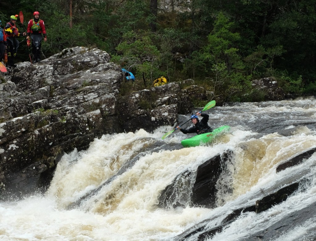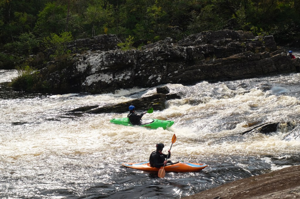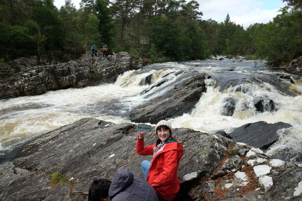 After being woken up by Calum stomping around the marquee, Osian, Junyi and I drove the club van to scout the Upper Moriston before the rest of the club arrived. It had been about two months since I’d last done any paddling due to holidays and university commitments, so the idea of dropping straight into Top Drop (where several people have recently dislocated their shoulders) made me a little apprehensive; thankfully I felt great hopping back into my T-Rex and after one warm-up lap taking the righthand line I was back on form and hyped for a lap down the left! Top Drop went perfectly the second time around (we won’t talk about the first), Sticky Hole (main picture) was just as satisfying as usual and Cheese Grater grated my elbow so I was thankful for the elbow pads. I think it’s safe to say that mine and Osian’s lines improved with every lap (of which we did three), and Junyi styled the one he joined us on – although was apparently too lazy to walk up to the top for another… tut tut tut.