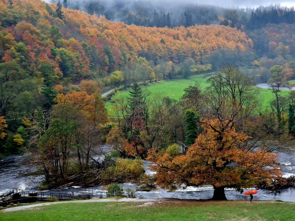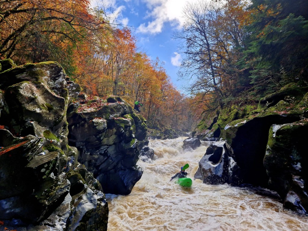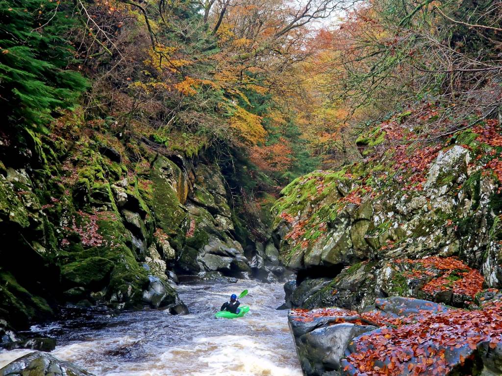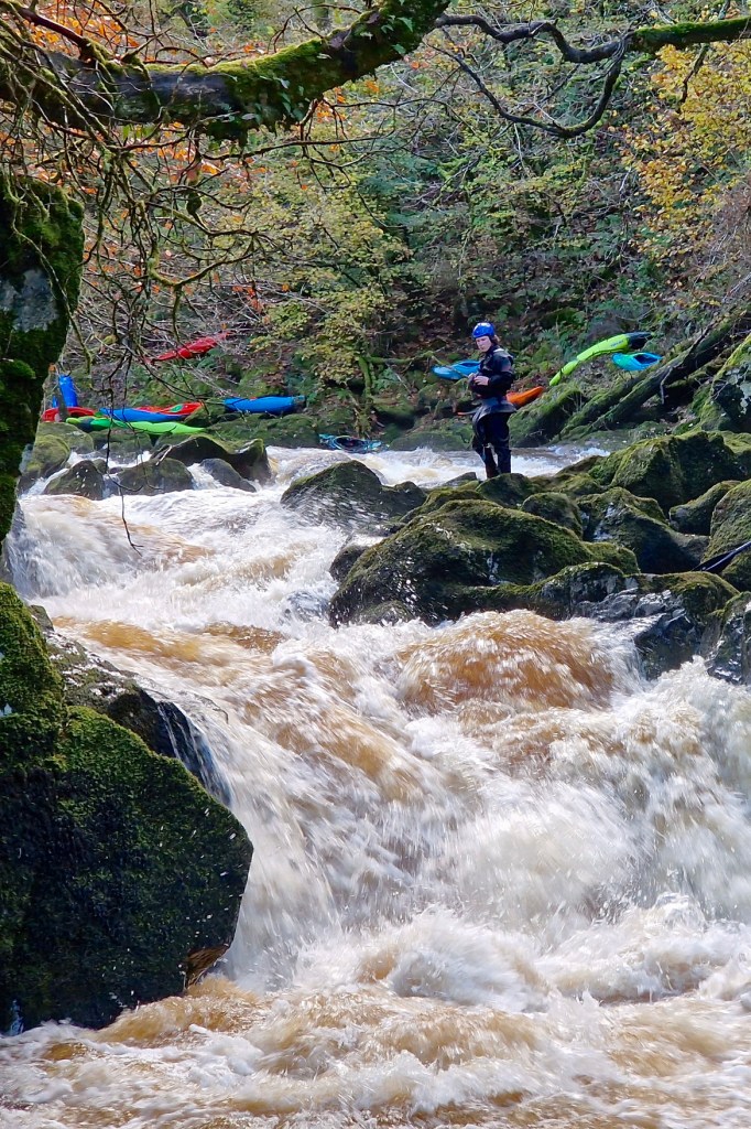 As many of us had hoped, the Fairy Glen was in on Saturday morning. None of us had paddled it before but it was a good level for a first time down so we split into groups of 5 and went from there. With lots of scouting (especially of Fairy Falls) the first run took us more than 3 hours, but the company was great and the scenery was even better with blue skies and autumn colours! We emerged from the gorge tired but pumped, the walls falling away and the sun low in the sky. Some people rushed off to the Glasglyn but about half of us wanted another run down the Glen, the second lap only took us 30 minutes but it was a chance to clean up some of the lines and properly get into the zone.